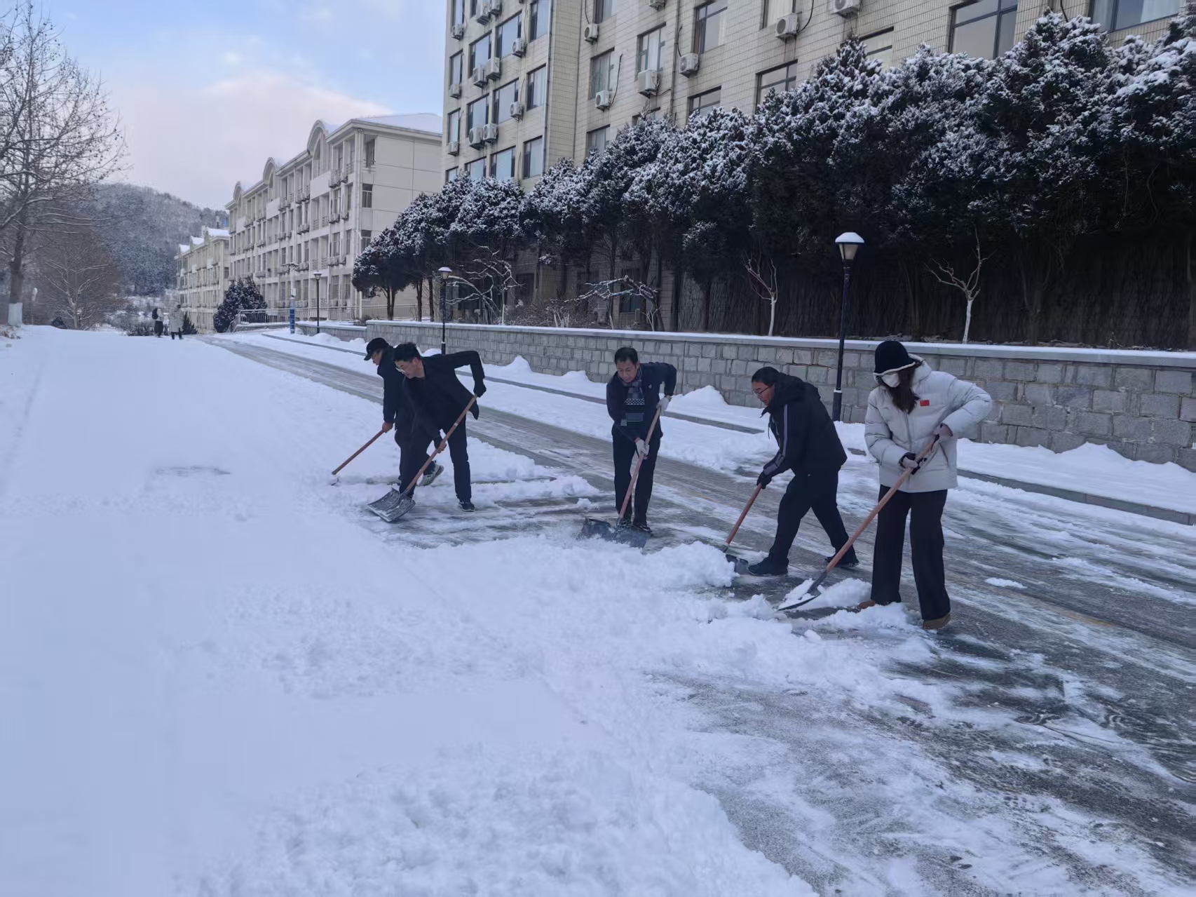 扫雪现场,师生们分工明确、密切协作,有序清理学院楼前、周边主干道及通行关键区域的积雪与薄冰。虽然天气严寒,但是师生热情不减,充分彰显了区域国别学院师生甘于奉献的优良作风和主动担当的责任意识。