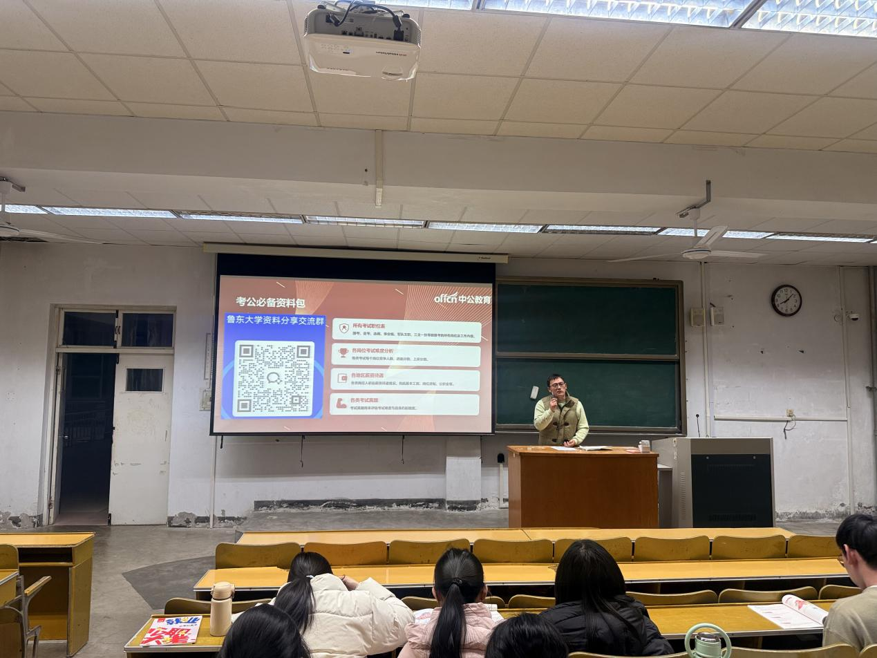 活动首先由主讲嘉宾围绕大学生“待机”与“蓄能”两种成长状态展开分享,深入剖析大学期间规划空白、能力薄弱对未来发展带来的制约。接着,中公教育专家结合当前就业形势与区域国别学院专业特色,详细讲解职业发展路径、就业选择方向、综合能力提升及备考规划等内容,为同学们提供系统、精准、实用的指导。同时,专家与学生开展互动交流,逐一解答学业与职业发展中的困惑。最后,褚少尉老师总结本次宣讲核心内容,鼓励学生以主动蓄能的姿态规划大学生涯。