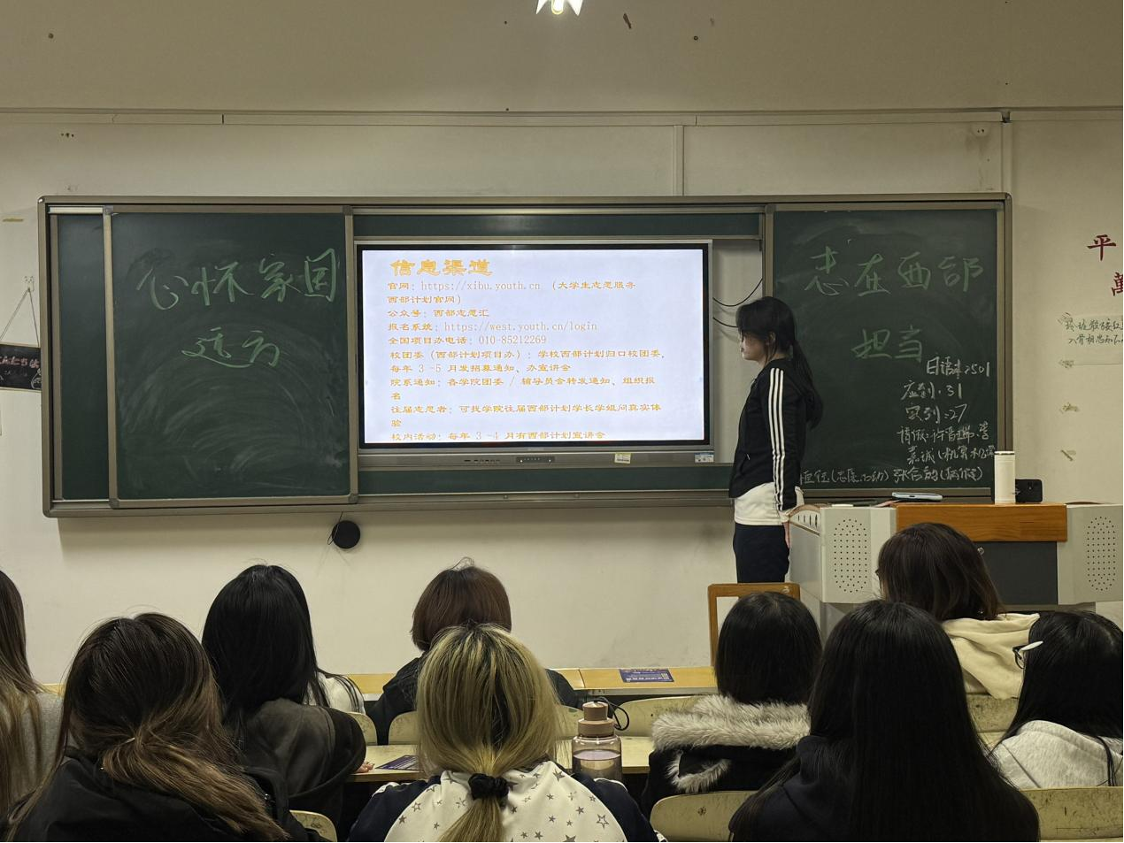 活动伊始,团支书以“时代的召唤与青年的使命”为题,带领全体团员开展理论学习,研读国家西部大开发相关政策文件,回顾西部大开发历史进程与成就,明确青年应将个人理想融入国家发展大局的责任。在先进事迹学习环节,全体团员观看大学生志愿服务西部计划纪实影像,学习扎根边疆青年的奋斗事迹,感悟“奉献、友爱、互助、进步”的志愿精神,接受榜样力量熏陶。活动尾声,团支书总结活动并寄语全体团员,要求大家以榜样为镜,刻苦钻研专业知识、练就过硬本领,响应祖国召唤,将“小我”融入“大我”,在祖国需要的地方奉献青春。